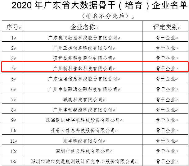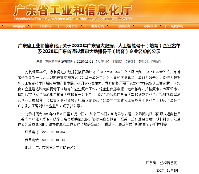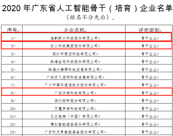 11月23日,广东省工业和信息化厅发布了关于2020年广东省大数据、人工智能骨干(培育)企业名单的公示。BB贝博艾弗森科技凭借着突出的人工智能创新能力和产业带动作用,入选2020年广东省人工智能骨干企业名单,同时,BB贝博艾弗森科技控股子公司方纬科技、参股公司云从科技入选该名单,BB贝博艾弗森科技全资子公司新科佳都入选2020年广东省大数据骨干企业名单。